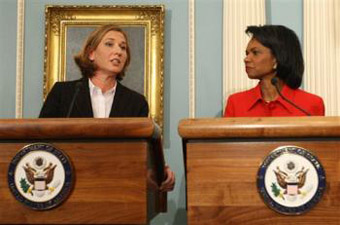 Israeli Foreign Minister Tzipi Livni, left, talks as Secretary of State Condoleezza Rice, right, looks on during a signing ceremony at the State Department in Washington, Friday, Jan. 16, 2009